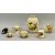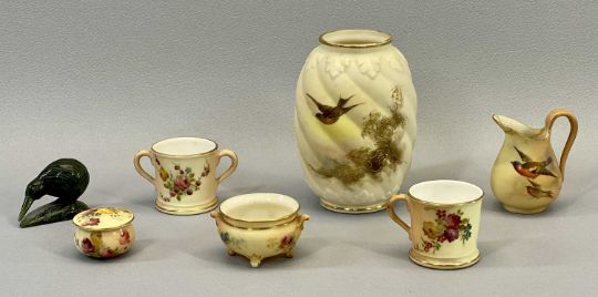 ROYAL WORCESTER, GRAINGER'S WORCESTER CABINET PORCELAIN & MINIATURES, 6 PIECES and a small carved Jadeite model of a Kiwi, the Grainger's Worcester vase No 260/G2472 having gilt highlighted bird decoration, 11cms H, the Royal Worcester miniatures all blush decorated to include a four footed pot No 2037 pattern, jug with bird decoration, a two-handled mug, single handed mug and small circular box and cover, all having floral decoration