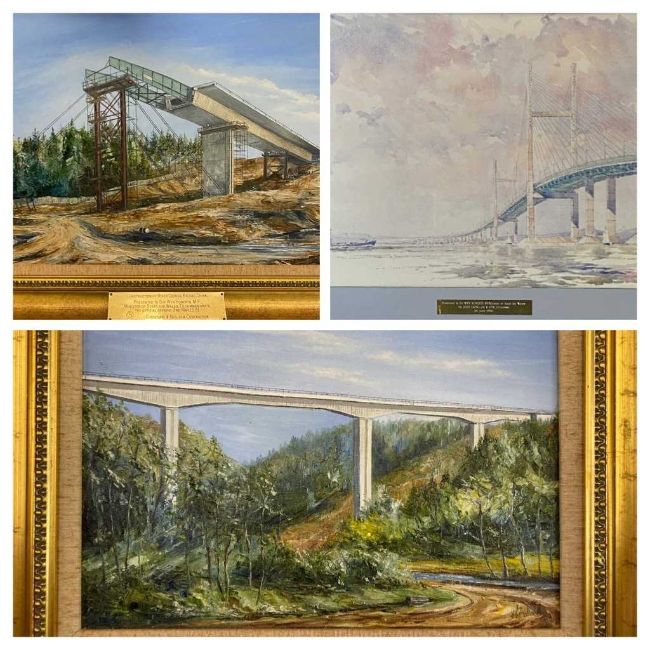 INITIALLED 'R W' watercolour - The Severn Bridge with ship and other yachts nearby, with presentation plaque 'To Sir Wyn Roberts, MP Minister of State for Wales', initialled and dated '89, 59 x 82cms, and, PATRICIA BALLARD (2) one oil on canvas - similar presentation painting for Newbridge Bypass, 23.5 x 34cms and one oil on board - River Ceiriog Bridge, Chirk, 35 x 48cms