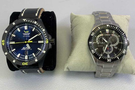 GENTLEMAN'S FASHIONABLE WRISTWATCHES (2) - to include a Vostok Europe Almaz Space Station, 0166/3000, water resistant blackened stainless steel case with leather strap, appears as new and working when listed, original box and packaging with associated paperwork, the other being a Citizen Eco Drive stainless steel bracelet wristwatch, boxed, no instructions