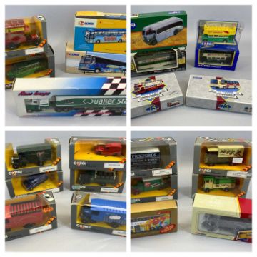 BOXED CORGI DIECAST COMMERCIAL BUSES, WAGONS & VANS - 23 items, all in original boxes to include the 43505 Blackpool Ballroom Tram, Grey Green Coaches A E C Regal, Thorneycroft Bus, Pickfords Removers, Bedford Pantechnicon and various others