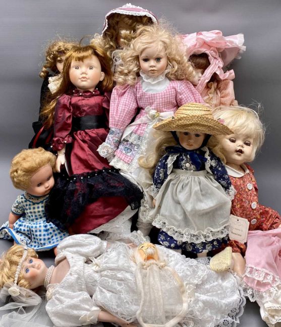 VINTAGE & LATER COLLECTOR'S DOLLS - a quantity including vintage composition and modern porcelain head examples. 58cms the tallest and VINTAGE & LATER BOOKS & MAGAZINES - including 1895 and later bound volumes of Punch magazine, English Mechanics magazines, workshop manuals, J R R Tolkien The Lord of The Rings paperback 1995, ETC