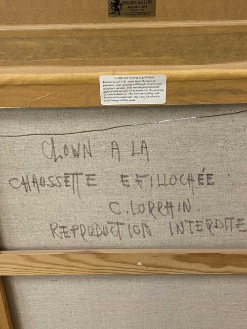 C LORRAIN oil on canvas - colourful depiction of a seated clown, 'Clown A La Chaussette Efillochee', 60 x 49cms