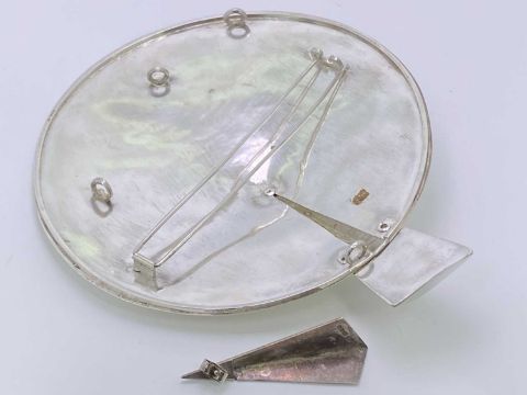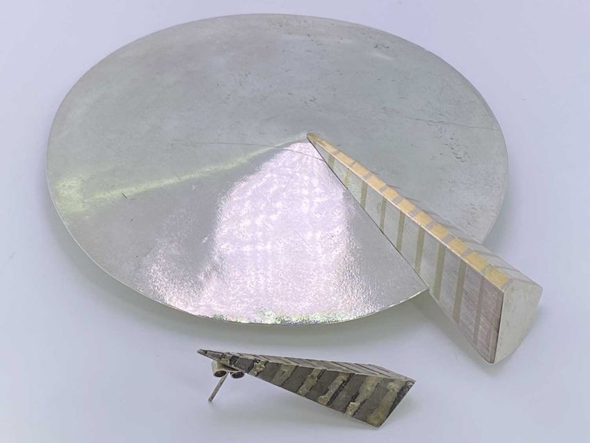 A LARGE CIRCULAR SILVER 'DISC' BROOCH - with arrow shaped attachment, 10cms diameter, London 1985, 39.5grms, Maker's mark indistinct, together with a single arrow shaped multi-coloured drop earring, 3grms, Maker J N