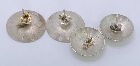 925 SILVER DISC SHAPED EARRINGS, A PAIR - each bearing a smaller disc with a square pattern, London 1977, 6.3grms, Maker c m, and a pair of believed silver disc type earrings, each bearing a triangular yellow metal pattern, 3.6grms