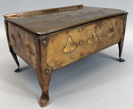 'ARTS & CRAFTS' COPPER CASKET - having a hinged lid and riveted corner supports on stylised feet, the top and all the side panels decorated with raised stylised leaves, fitted with interior brass lock, no key, no visible maker's marks, 12.5cms H, 25cms max W, 17cms max D
