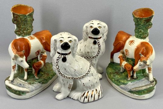 STAFFORDSHIRE POTTERY ORNAMENTS, TWO PAIRS - to include two gilt decorated white seated spaniels and two cow and calf spill holder ornaments, 23 and 27.5cm heights respectively