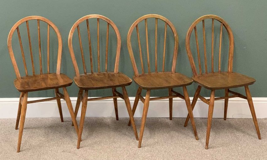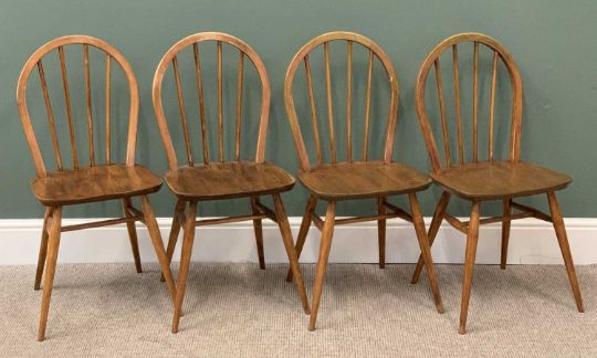 CIRCULAR OAK EXTENDING DINING TABLE and two leaves, 75cms H, 115cms diameter (closed), 215cms long (fully extended) with four stickback hoop dining chairs, 86cms H, 39.5cms W, 34.5cms D