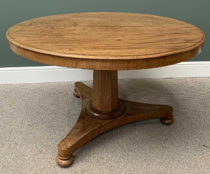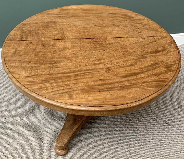 VICTORIAN MAHOGANY TILT TOP BREAKFAST TABLE, the 114cms diameter top on a segmented column and trefoil base with bun feet, 72cms H