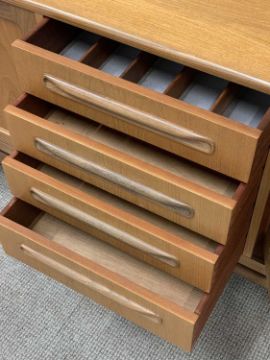 MID-CENTURY G-PLAN FRESCO LONG SIDEBOARD having four central drawers and twin double opening cupboard doors, on a stylish lower base, 79cms H, 213cms W, 46cms D