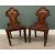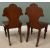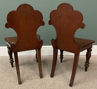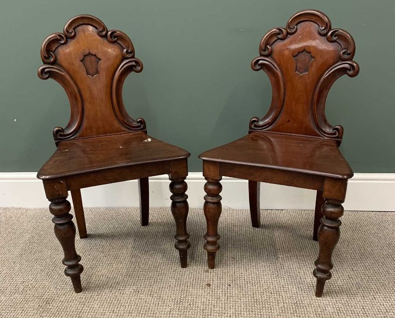 VICTORIAN MAHOGANY HALL CHAIRS, a pair, with carved scroll work backs, on turned front supports, 80cms H, 44cms W, 32cms D