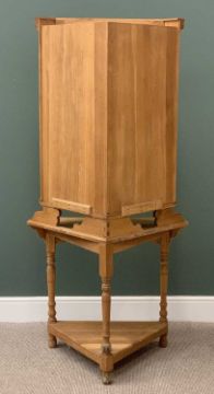 QUALITY REPRODUCTION CARVED OAK CORNER CABINET on stand, profusely carved with various details to a single cupboard door top with brass "H" hinges, semi-open centre shelf above a mask carved frieze and under tier shelf, on turned and block supports, 186cms H overall, 92cms W, 55cms D