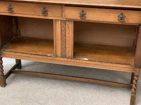 VINTAGE OAK MIRROR BACK SIDEBOARD having carved and beaded detail to the chamfered mirror single shelf back with barley twist supports over a two drawer and two cupboard door base, on barley twist and block supports with cross-stretcher, 161cms H overall, 137cms W, 47cms D
