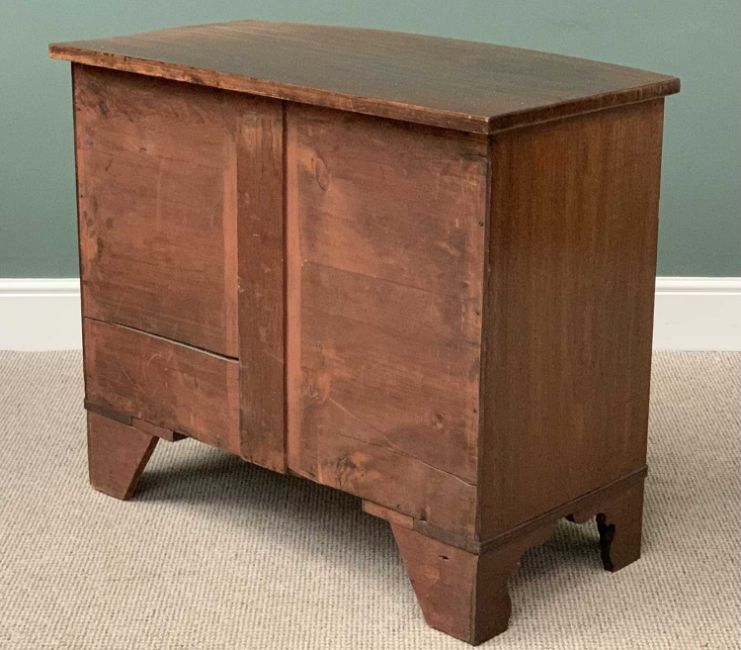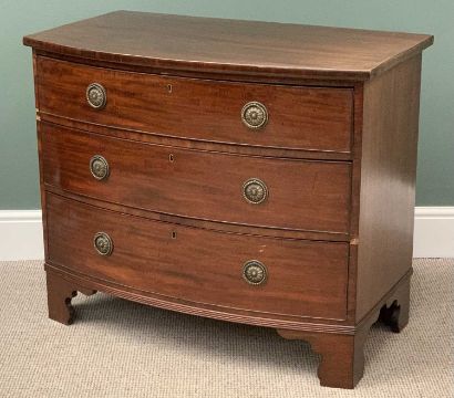 19th CENTURY MAHOGANY BOW FRONT CHEST of three drawers having ring pull handles, on corner bracket feet, 82cms H, 97cms W, 56cms D