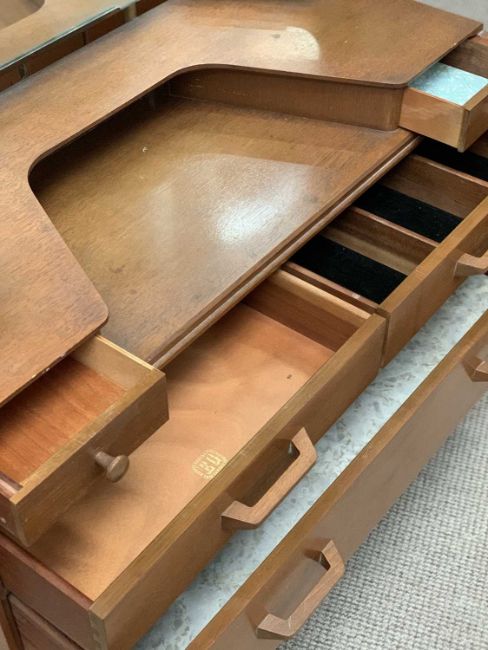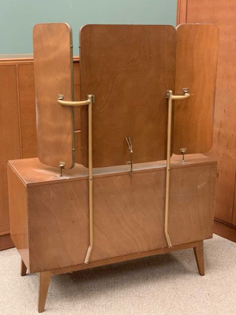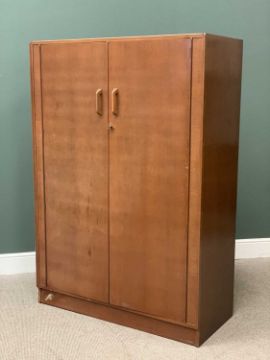 G-PLAN GOLD LABEL THREE PIECE BEDROOM SUITE comprising two door wardrobe, 178cms H, 122cms W, 53cms D, tallboy, 122cms H, 88cms W, 46cms D and mirrored dressing table, 103cms H, 147cms W, 58cms D