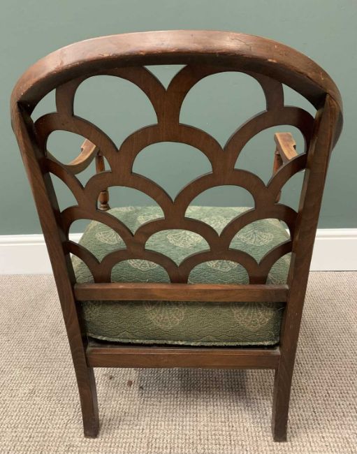 ANTIQUE & VINTAGE ARMCHAIRS, various x 4, to include a rush seated farmhouse example, 85cms H, 53cms W, 44cms D, interesting double twist stick back armchair with cane work seat, 95cms H, 54cms W, 46cms D, vintage oak example with upholstered drop-in seat pad and fretwork back, 76cms H, 52.5 cms W, 43cms D and a circa 1900 inlaid mahogany armchair having ribbon swag detail to the back splat, swept open arms and front tapering supports with spade feet, 83cms H, 45cms W, 44cms D