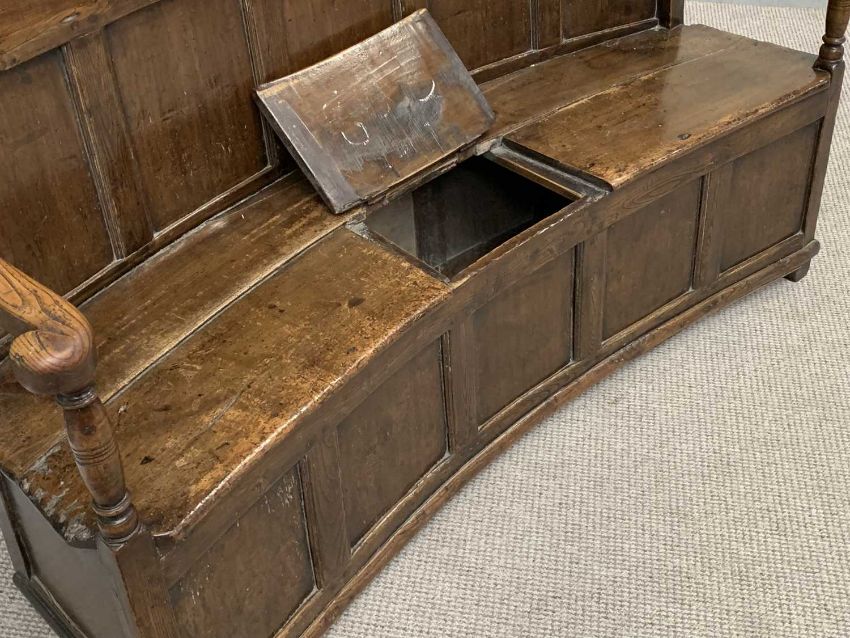 ANTIQUE ELM CURVED BACK BOX SEAT SETTLE, peg-joined construction having an eight panel back and open arms with curled ends, on turned supports, with lift-up centre section to the seat and a curved lower five panel front, 128cms H, 160cms W, 68cms D