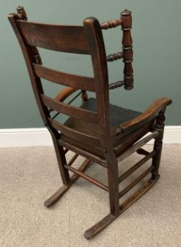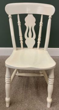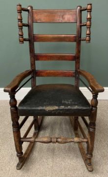 VINTAGE AMERICAN ROCKER ARMCHAIR, 105cms H, 60cms W, 43cms D and two further chairs including a mahogany hall chair with carved and shaped back, 87cms H, 36.5cms W, 33cms D and a white painted farmhouse type chair, 86cms H, 37.5cms W, 35cms D