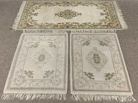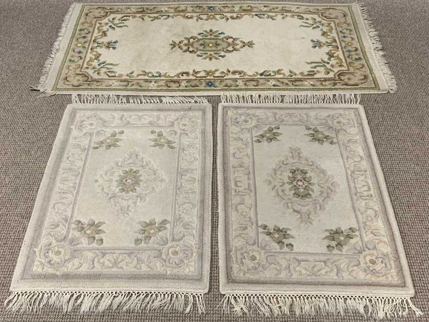 G H FRITH & OTHER CREAM GROUND RUGS (3), all having similar central floral pattern and bordered edging, 160 x 80cms the largest