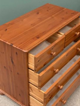 REPRODUCTION PINE BEDROOM FURNITURE (3) to include a chest of two short over three long drawers with turned knobs and bun feet, 76cms H, 89cms W, 44cms D, a four drawer dressing table, 76cms H, 100cms W, 44cms D and a swing dressing mirror, 62 x 56cms