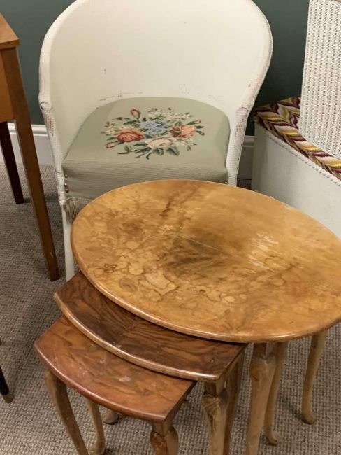 VINTAGE FURNITURE PARCEL (6) to include a loom type blanket chest, curved back bedroom chair and linen box, mid Century sewing box on black supports, nest of three walnut tables, the largest with an oval top and a wooden framed firescreen with woolwork panel