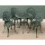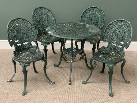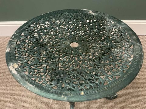 GREEN PAINTED ALUMINIUM FIVE PIECE GARDEN FURNITURE SET comprising circular topped table, 66cms H, 72cms diameter and four circular seated chairs, 82cms H, 37.5cms diameter seats