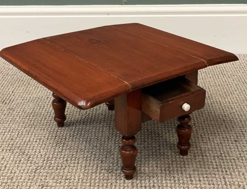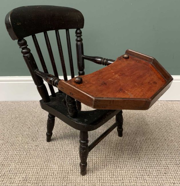 CHILD'S ARMCHAIR in farmhouse style with spindleback and turned supports, screw-on front tray and potty aperture to the seat, 57cms H, 39cms W maximum, 25cms D, an apprentice style pine miniature Sutherland table having twin side flaps and single end drawer with porcelain knob, on turned supports, 21cms H, 34cms L, 21cms W and a small collector's chest of two drawers, 20cms H, 25cms W, 21cms D