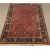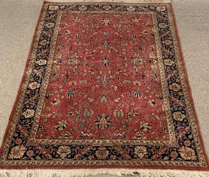 EASTERN STYLE WOOLLEN RUG with tasselled ends, red ground with blue multi-border, the central panel with opposing floral pattern, 220 x 148cms