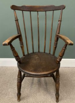 THREE VINTAGE HIGHBACK CHAIRS to include a circular seat stick back armchair on turned supports, 99cms H, 58cms W, 47cms D and a circular seated pair with curved spindle and stick backs