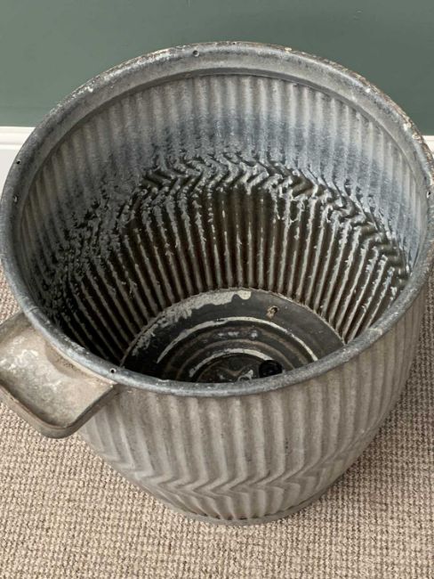 ASSORTED METALWARE to include galvanized washtub, 54cms H, 47cms diameter, vintage milk churn, 76cms H, 34cms diameter and a metal lantern frame, 82cms H, 36cms diameter