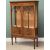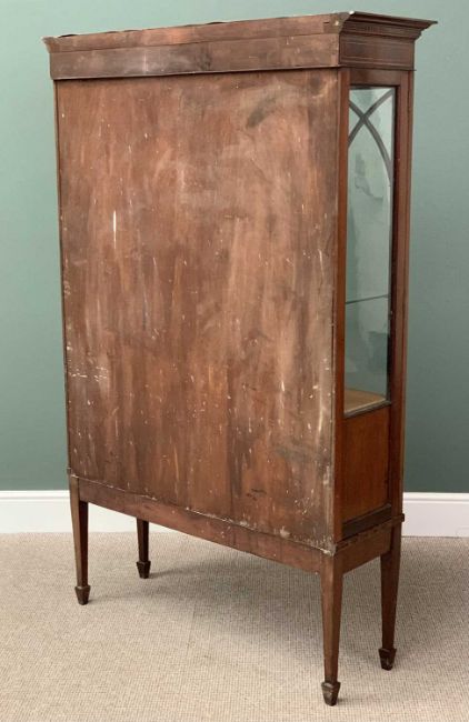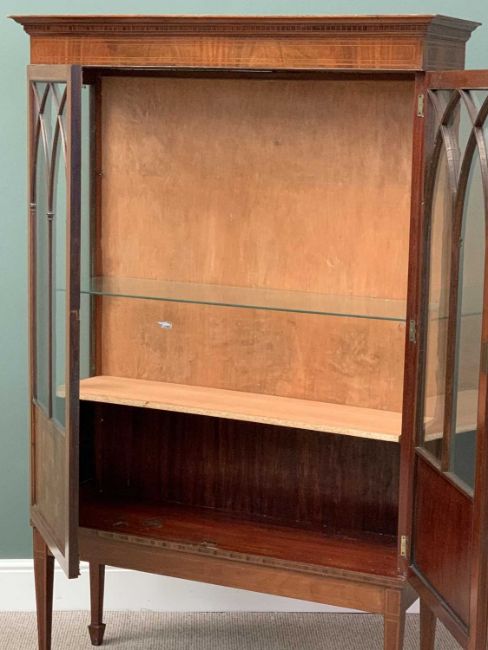CIRCA 1900 BOXWOOD STRING INLAID MAHOGANY CHINA DISPLAY CABINET having twin glazed doors with Gothic arch beading and lower panels, interior glass shelving, on tapering supports and spade feet, 182cms H, 115cms W, 30cms D