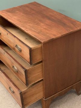 GEORGIAN MAHOGANY CHEST of three drawers with oval ribbon swag backplates and swing handles, cock-beaded drawer edging, on splayed corner feet, 91cms H, 93cms W, 53cms D