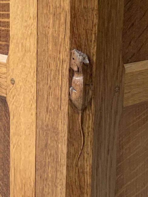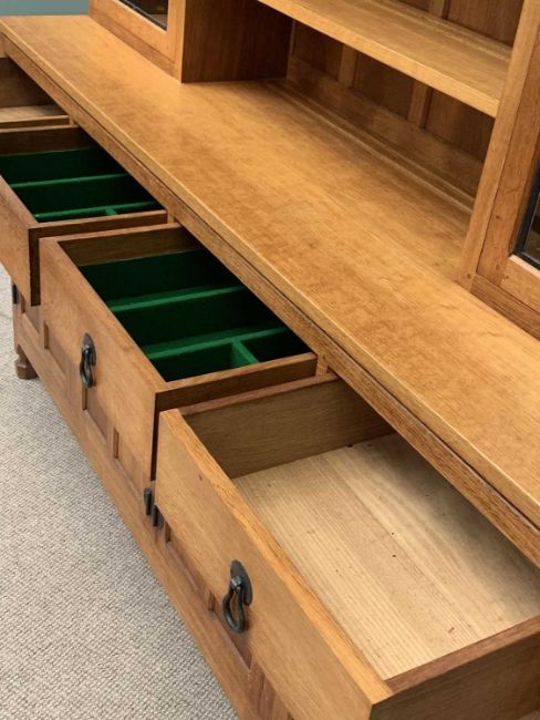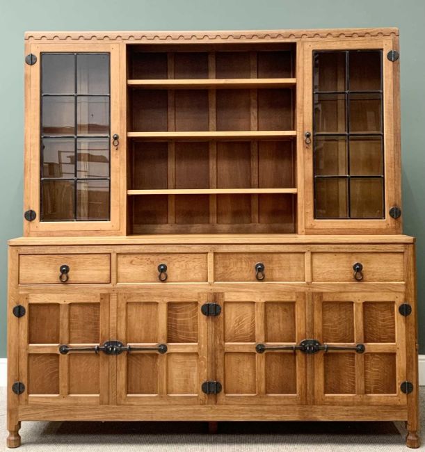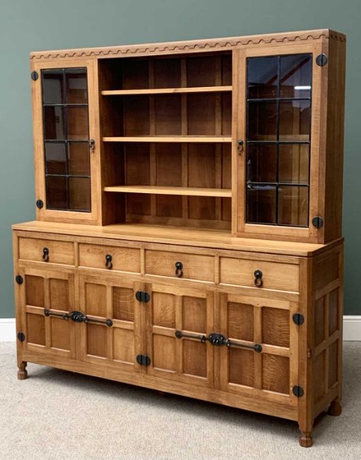 ROBERT "MOUSEMAN" THOMPSON (KILBURN) ADZED OAK 6ft DISPLAY SIDEBOARD having carved detail to the top and Adzed sides to a central arrangement of three adjustable shelves and flanking glazed cupboard ends with interior glass shelves, the Adzed top base having four frieze drawers and twin pairs of opening cupboard doors with iron work hinges, catches and handles, signature mouse carved to the right side edge, 191cms H overall, 183cms W, 46cms D