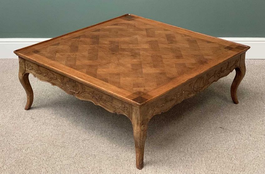 ITALIAN HARDWOOD COFFEE TABLE with parquet block detail to the top and carved shell with floral swag detail to the frieze, on shaped supports, 39cms H, 100 x 100cms top