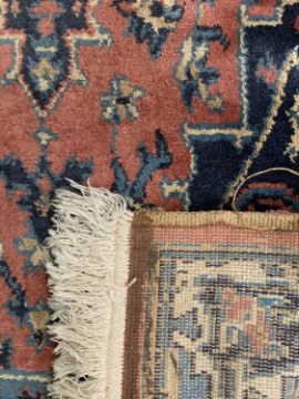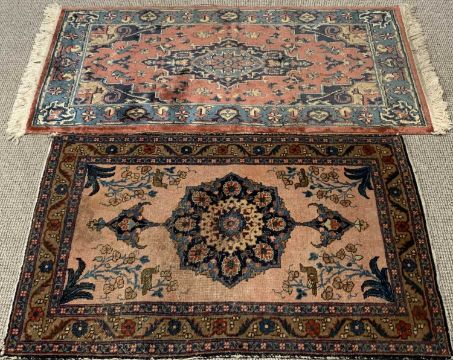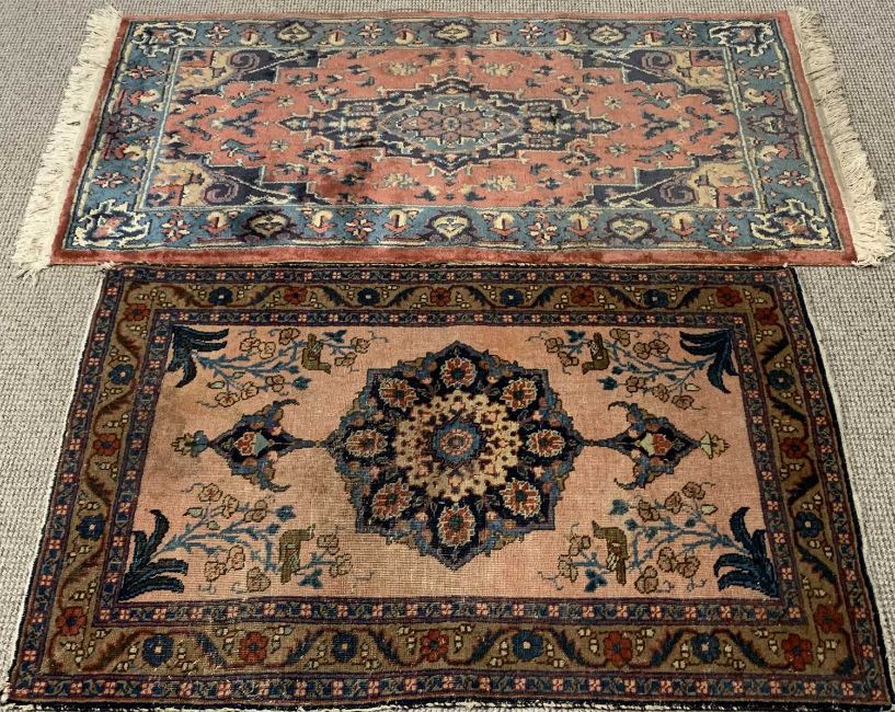 EASTERN STYLE WOOLLEN CARPETS (2), pink ground with opposing central pattern and bordered edgings, 130 x 84cms and 155 x 76cms
