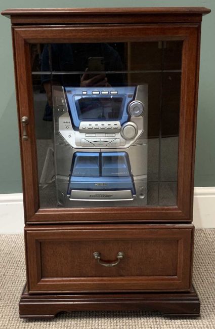 PANASONIC MODERN MINI HIFI SYSTEM in a mahogany effect cabinet, 79cms H, 48cms W, 45cms D and a BRDR Furbo Danish side table, 45cms H, 47 x 47cms top
