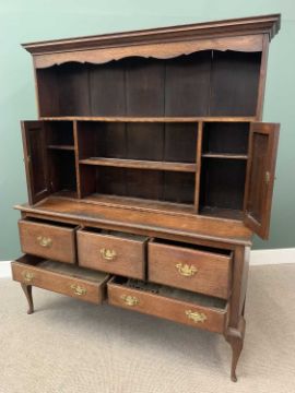 19th CENTURY SHROPSHIRE OAK DRESSER, the upper rack having wide backboards and shaped front frieze, single long shelf over twin central shelves flanked by applied panel cupboard doors, on a two plank top base section of three deep and two shallow opening pine lined drawers with fancy brass backplates and swan neck handles, on Queen Anne front supports, 206cms H overall, 166cms W maximum, 52cms D maximum