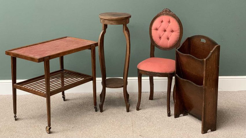 VINTAGE & LATER FURNITURE PARCEL (4) to include an oak magazine stand, 81cms H, 40cms W, 15cms D, pink upholstered button back side chair, 97cms H, 40cms W, 46cms D, circular two tier planter stand, 94cms H, 37cms diameter maximum and a mid-Century table trolley with under tier magazine shelf, 69cms H, 73cms W, 43.5cms D