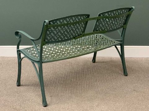 GREEN PAINTED METAL TWO SEATER GARDEN BENCH, 88cms H, 116cms W, 64cms D