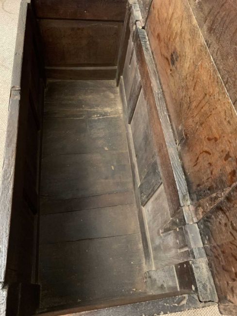 ANTIQUE OAK COFFER having a twin plank top with cleated ends, iron lock and hinges with a front carved upper frieze over a three panelled front with further carved detail, on stile feet, 70cms H, 128.5cms W, 52cms D