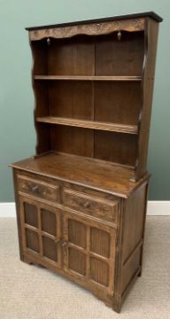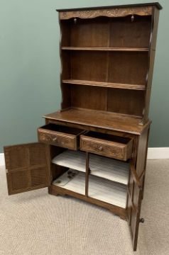 REPRODUCTION OAK DRESSER having carved detail to the two shelf rack over a base section with two frieze drawers and twin cupboard doors, 175cms H overall, 83cms W, 42cms D