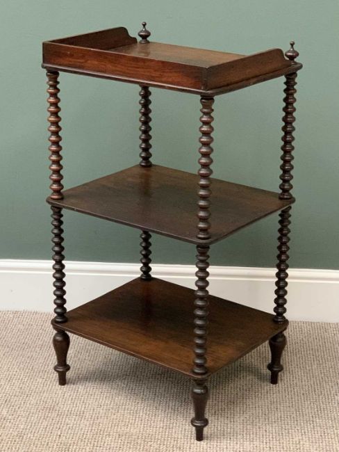 VICTORIAN ROSEWOOD THREE TIER WHATNOT, the top with closed rail to three sides and turned finial caps on bobbin supports and turned feet, 93cms H, 51cms W, 41cms D
