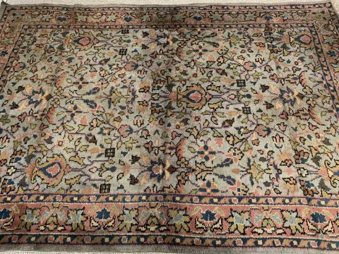 EASTERN STYLE WOOLLEN CARPET, blue/grey ground with wide pink border and repeat traditional floral pattern, 270 x 188cms