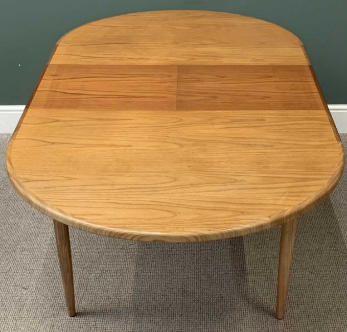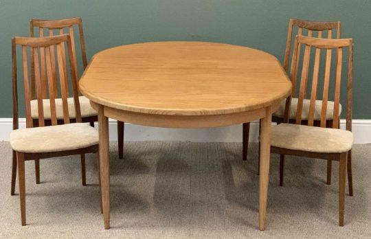 G-PLAN RED LABEL OVAL EXTENDING DINING TABLE, 73cms H, 163cms (closed), 208cms (fully open) and four chairs, 90cms H, 48cms W, 40cms D