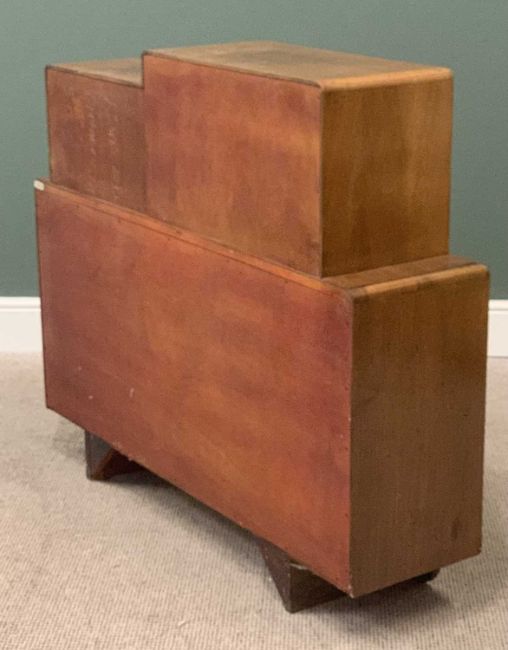 CIRCA 1930 WALNUT BUREAU BOOKCASE having a drop down fall and open cupboard to the top over a base arrangement of four drawers and twin glass sliding doors, on a plinth base, 105cms H overall, 122cms W, 32cms D
