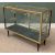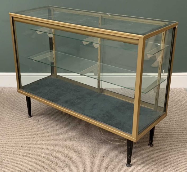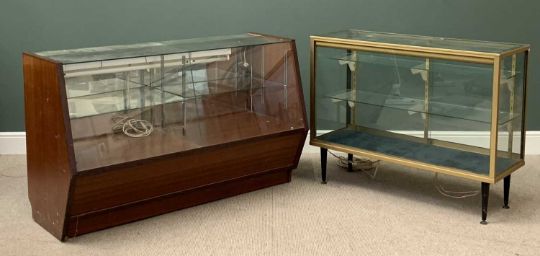 SHOP COUNTER DISPLAY CABINETS (2) to include a 5ft example in mahogany effect and sloped front with glass interior shelves, 94cms H, 153cms W, 62cms D and a 4ft example having brass type finish and stepped interior adjustable shelves, 95cms H, 120cms W, 45cms D