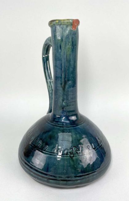 EWENNY POTTERY JUG mottled green-blue glaze, long neck, applied loop handle, sgraffito insribed with Iolo Morgannwg's 'Llaw lan diogel ei pherchen' (Safe is the owner of a pure heart), stamped EWENNY JONES, 24cms high