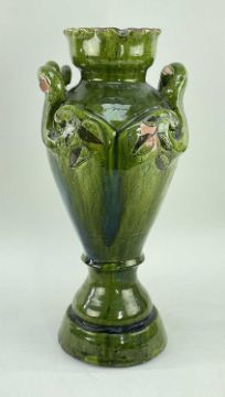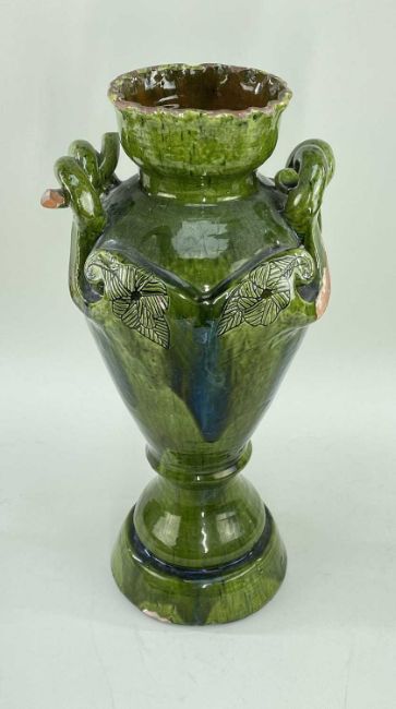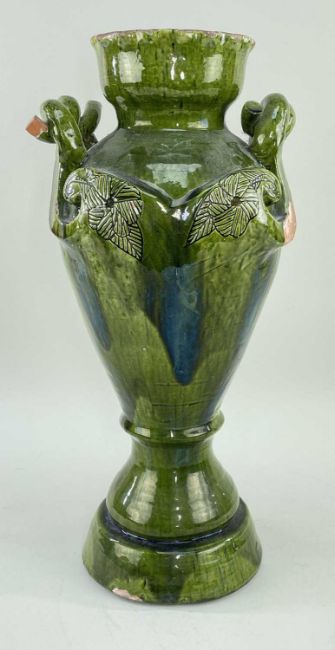 LARGE EWENNY POTTERY AMPHORA SHAPED VASE having twin rope-twist handles with floral incised terminals, the neck with crimped rim, base inscribed Jones, Ewenny for Evan Jones, circa 1902, 50cms high