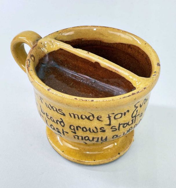 EWENNY POTTERY SHAVING MUG in yellow glaze, with loop handle, the bowl halfed into shallow and deep compartments, sgraffito inscribed 'This pot was made for Evan James, Who's beard grows stout and strong, May this pot many a year and Evan live twice as long', 8cms high