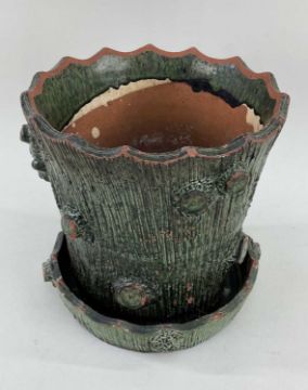 EWENNY POTTERY PLANT POT & SAUCER of naturalistic tree trunk form with bark texture and truncated branches, in white slip over red body and dark green glaze, both elements inscribed to the base Ewenny Pottery 1912, 21cms high