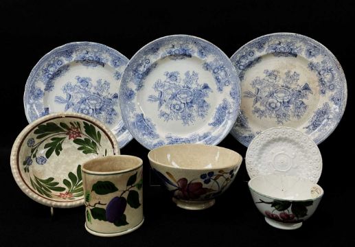 WELSH (& OTHER) POTTERY GROUP comprising rare Llanelly-type pottery plum preserve pot (lacks lid), 9cms diam, a Llanelly floral fruit dish with moulded border, a daisy moulded child's plate, a Llanelly cherry decorated small bowl and another, three Asiatic Pheasant transfer dinner plates (8) Provenance: private collection Cardiff